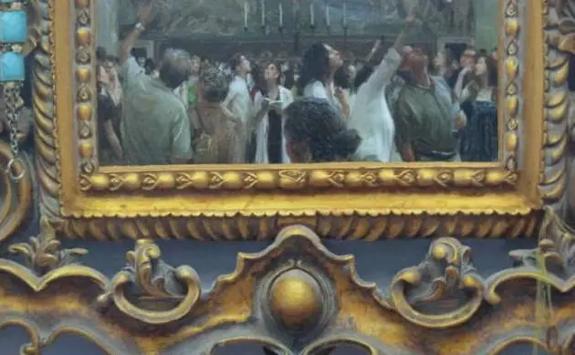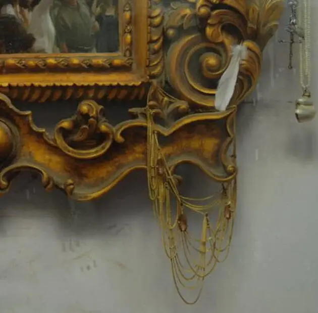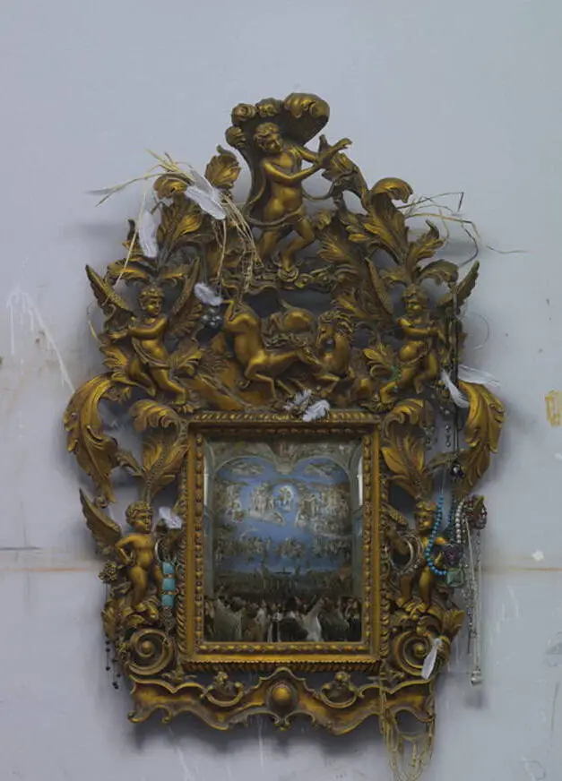 创作《天光》,其灵感来源于一次旅游,在罗马西斯庭大教堂里,光线比较暗,连接拱形高耸的天顶与高墙的是一幅米开朗基罗绘制的天顶壁画《创世纪》和《最后的审判》,画面繁复生动,气势却显得庄严凝重。来参观这幅壁画的人特别多,各个国家的人,不同肤色的脸仰望着,不同肤色的手四处指指点点,不同的语言唧唧呀呀……惶恐中似乎真要经历一次上帝对人类的审判。也许上帝并不存在,但今天的人类要自我救赎,难道不需要一次精神上的自我审判吗?感慨之下冷军创作了这幅《天光》,将这样的场景镶嵌在一个硕大而又繁复的古典金色画框里,画框是几个无邪的小天使手持羽毛座驾圣马腾空而起的场面。整个画面设计既有些现代感又凝重神圣,意在告诫人们反思自我,追溯根源,回归传统之精髓。也许是现在社会发展的快节奏带动了本该与资本无关的艺术界和现代经济相结合并形成十分混乱的病态局势,但很多人却浑然不知。