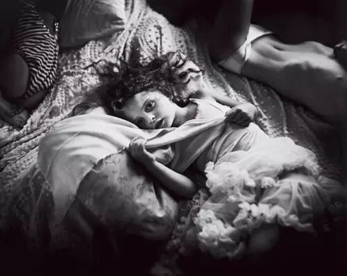 莎莉·曼恩在家中使用大画幅相机拍摄她的孩子杰茜·曼恩。阳光洒满的窗户下,她采取直接俯视的角度拍摄杰茜。