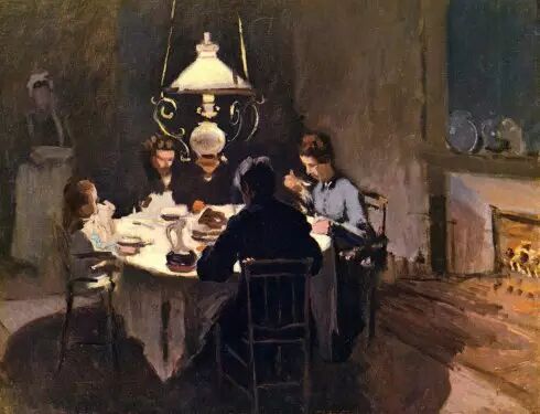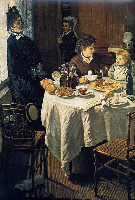 1868年,莫奈以家庭生活为原型创作的《午餐》,画面中坐在桌旁的少妇和小孩是以卡米勒和他们的儿子杰·莫奈为原型所创作。
