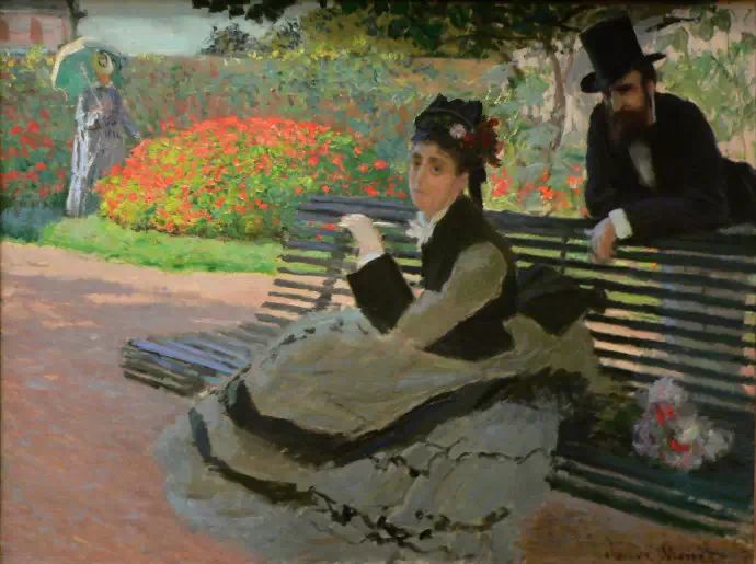 在《绿衣女子》之后,莫奈又创作了《花园中的女人们》,这是一幅风格迥异的作品,表现阳光穿过树叶,洒落在花丛和女人们衣裙上的变化。令人惊奇的是,画中四个女子,均由卡米勒一人,以不同的发型、衣裙和姿势充当模特。这样一幅饱含心血的画作,寄托着他们对生活和艺术的厚望,却被沙龙彻底否定,这就意味着他们的希望,将面临破灭。